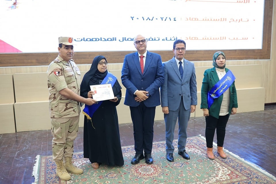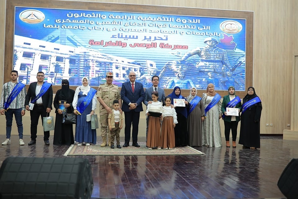 جاء ذلك بحضور العميد اركان حرب احمد مهدي عبد اللطيف مساعد قائد قوات الدفاع الشعبى والعسكري ، والدكتور السيد فودة نائب رئيس الجامعة لشئون خدمة المجتمع وتنمية البيئة ، والدكتورة جيهان عبد الهادي نائب رئيس الجامعة لشئون الدراسات العليا والبحوث ، والعميد حسام الدين عطوه المستشار العسكري للمحافظة ، والعقيد حافظ إبراهيم السيد مدير إدارة التربية العسكرية بالجامعة ، وعمداء الكليات ، وأمين عام الجامعة ، ومنسق عام الأنشطة الطلابية بالجامعة ، والأمناء المساعدين ، وعدد من أسر الشهداء ، وأساتذة وطلاب الجامعة.