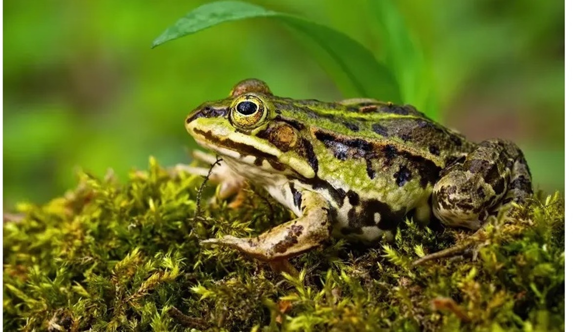 ضفادع المياه العذبة تتميز بلون أخضر مع بقع داكنة لتندمج مع محيطها وتختفي عن الأعداء.