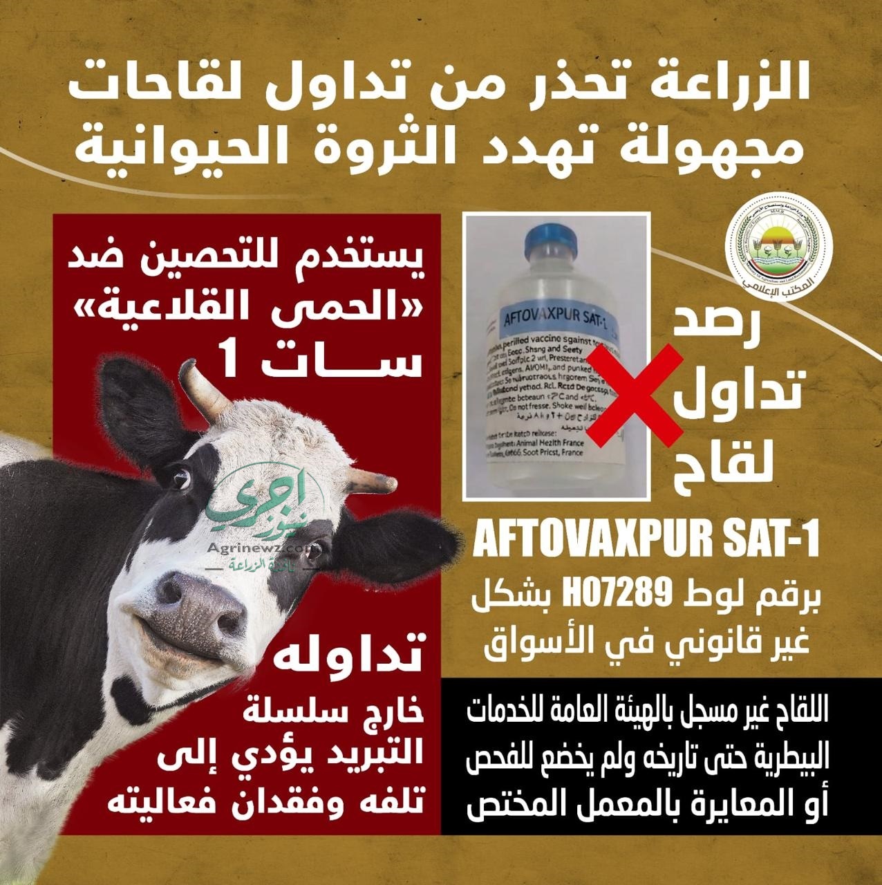 وقالت الهيئة العامة للخدمات البيطرية، أنه تم رصد تداول لقاح تحت مسمى: "أفتوفاكس بور سات-1" (AFTOVAXPUR SAT-1)، لافتة إلى أن العبوات المرصودة برقم لوط H07289، خاصة بلقاح حمى قلاعية عترة (SAT-1)، و إن استخدامه قد يؤدي إلى تفشي امراض وبائية يصعب السيطرة عليها، مما يهدد سلامة الماشية .