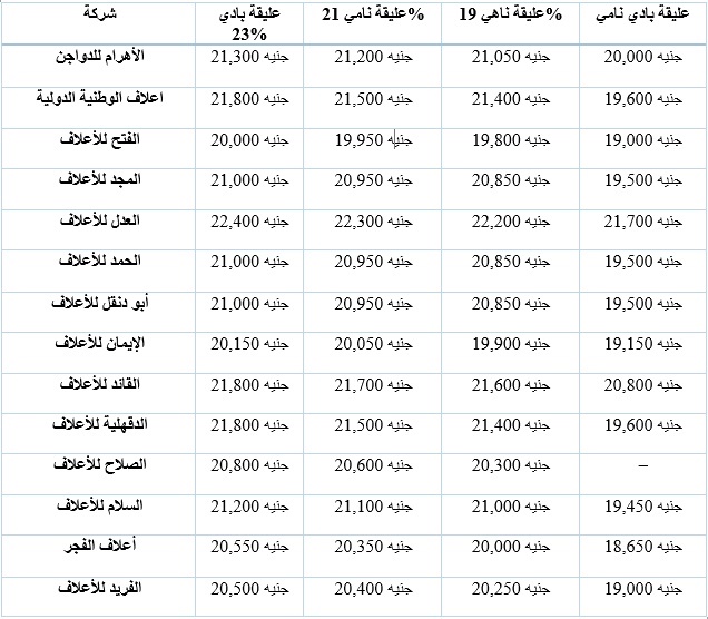 عليقة ناهي 19%: من 19,800 جنيه وحتى 22,200 جنيه.