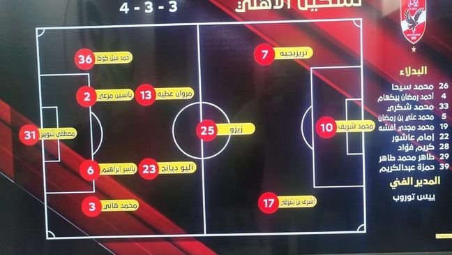 أعلن الجهاز الفني للنادي الأهلي بقيادة ياس توروب عن التشكيلة الأساسية التي ستخوض المباراة القادمة، معتمداً على طريقة اللعب 4-3-3 التي أثبتت نجاحها واستقرارها في المباريات الأخيرة.