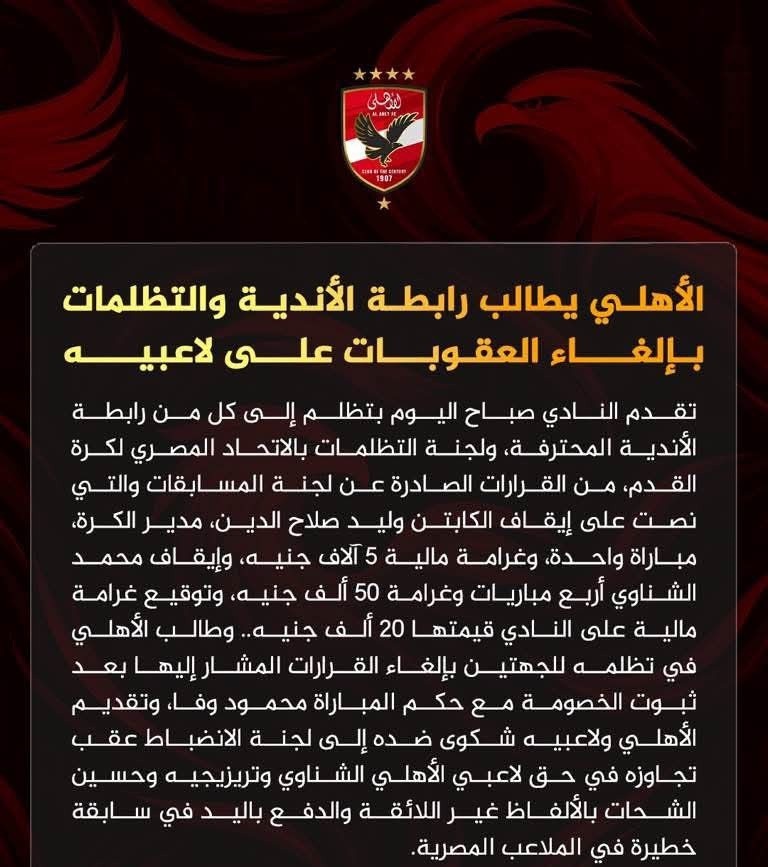 في خطوة تصعيدية تعكس حالة الغضب داخل القلعة الحمراء، تقدم ا لنادي الأهلي صباح اليوم بتظلم رسمي إلى رابطة الأندية المحترفة، ولجنة التظلمات بالاتحاد المصري لكرة القدم، اعتراضًا على القرارات الصادرة من لجنة المسابقات، والتي شملت إيقافات وغرامات بحق عدد من عناصر الفريق.