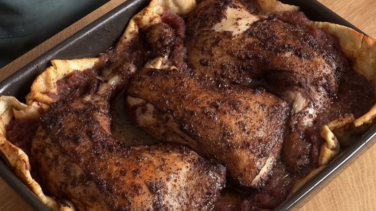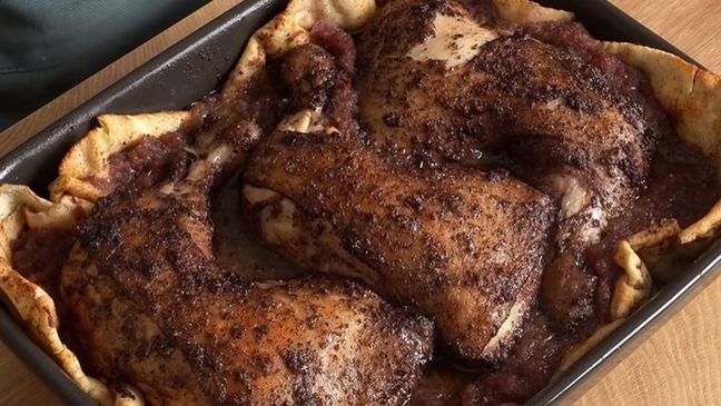 ضعي فوق العيش طبقة من خلطة البصل المقلية، ثم رتبي أوراك الدجاج المخبوزة على وجه البصل.