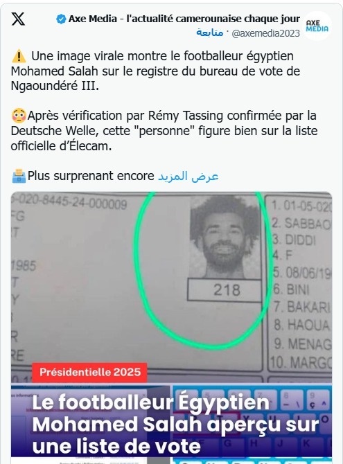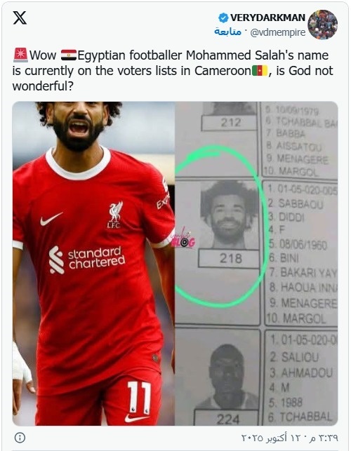 شمال منطقة أداماوا، وسط الكاميرون.لكن الأكثر غرابة من الاسم هو تاريخ الميلاد المُسجل، إذ يشير السجل إلى أن الناخب المزعوم من مواليد أغسطس 1985، في حين أن صلاح وُلد في 15 يونيو 1992.