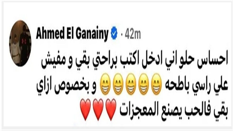 الجنايني منشورًا على صفحته الخاصة معلقًا على الخبر، قائلاً: إحساس حلو ان أكتب براحتى