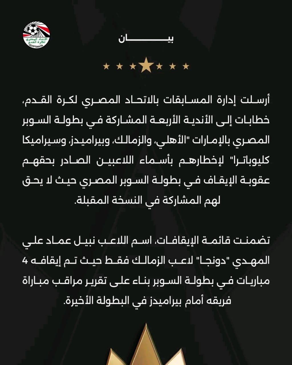 أعلنت إدارة المسابقات بالاتحاد المصري لكرة القدم في بيان رسمي، عن إرسال خطابات رسمية إلى الأندية الأربعة المشاركة في بطولة كأس السوبر المصري 2025 المقرر إقامتها في الإمارات العربية المتحدة، وهي: الأهلي، الزمالك، بيراميدز، وسيراميكا كليوباترا، لإخطارهم بأسماء اللاعبين الموقوفين الممنوعين من المشاركة في البطولة.