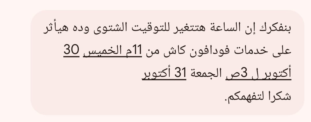 شركة فودافون مصر عن توقف مؤقت في خدمات فودافون كاش ابتداءً من الساعة 11 مساءً