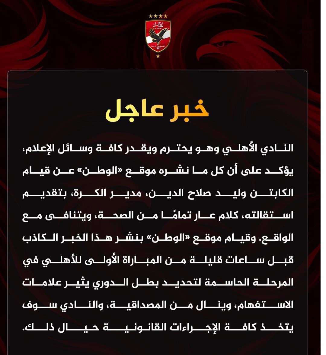 وجاء في بيان رسمي للنادي أن الأخبار التي نشرها موقع "الوطن" حول استقالة صلاح الدين لا تمت للواقع بصلة، وأوضح النادي أن توقيت نشر هذه الشائعة، قبل ساعات قليلة من المباراة المهمة في المرحلة الحاسمة لتحديد بطل الدوري، يثير العديد من التساؤلات حول نية المصدر ويضر بمصداقيته.