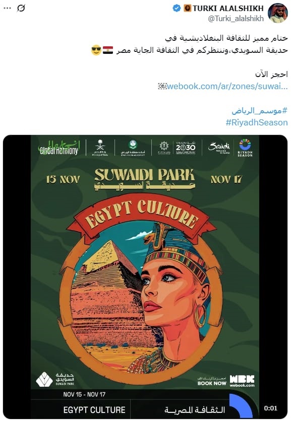 أعلن رئيس الهيئة العامة للترفيه في السعودية، المستشار تركي آل الشيخ، عودة الحضور الثقافي المصري إلى فعاليات موسم الرياض ابتداءً من 15 نوفمبر، بعد مرحلة شهدت تقليصًا ملحوظًا في مشاركة الفنانين المصريين لصالح الطاقات السعودية والخليجية.