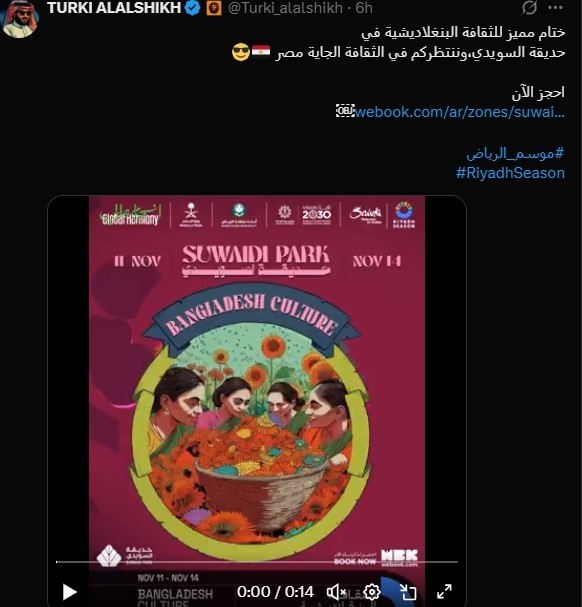 وجاء الإعلان عبر منصة "إكس" موضحًا انتهاء فعالية الثقافة البنغلاديشية في حديقة السويدي، تمهيدًا لانطلاق فعالية الثقافة المصرية، في خطوة أحدثت تفاعلًا واسعًا في الأوساط الفنية والجماهيرية في السعودية ومصر والعالم العربي.