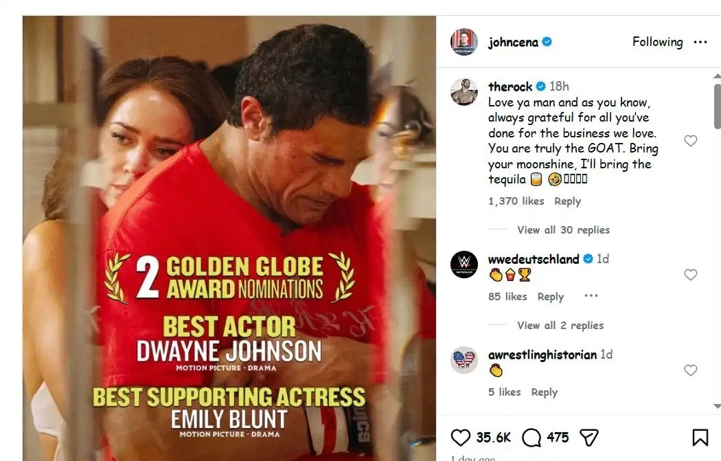 حرص ذا روك على توجيه رسالة تقدير لجون سينا، واصفًا إياه بأنه "الأفضل بلا منازع"، وذلك بعد منشور لسينا على إنستغرام يهنئ فيه ذا روك بترشحه لجائزة أفضل ممثل في الغولدن غلوب عن فيلم The Smashing Machine.