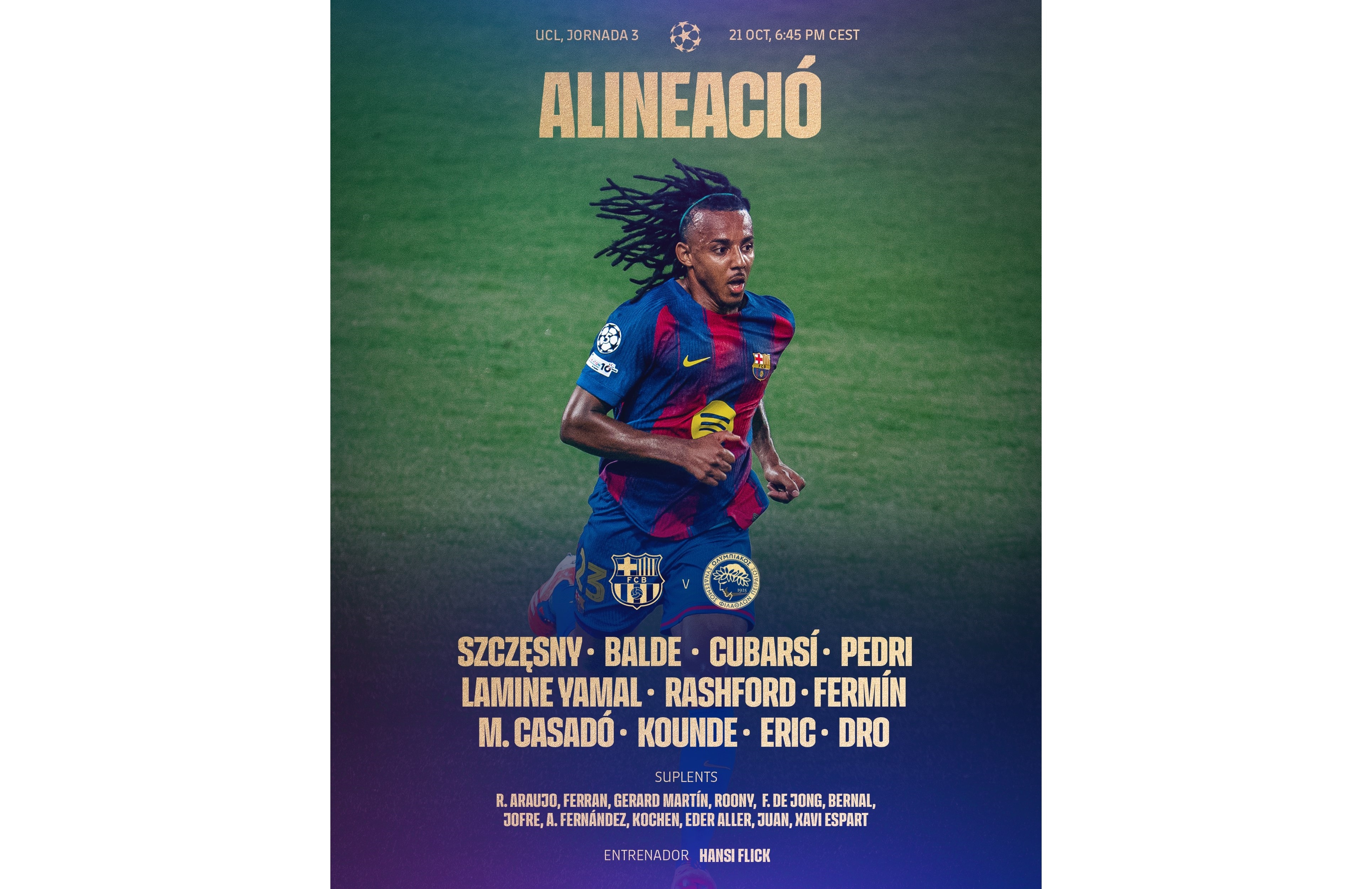 اعلن الألماني هانز فليك المدير الفني لفريق برشلونة، تشكيل فريقه لمواجهة أولمبياكوس اليوناني باستاد سبوتفاي كامب نو، ضمن منافسات الجولة الثالثة من مرحلة الدوري بـ بطولة دوري أبطال أوروبا 2025-2026.