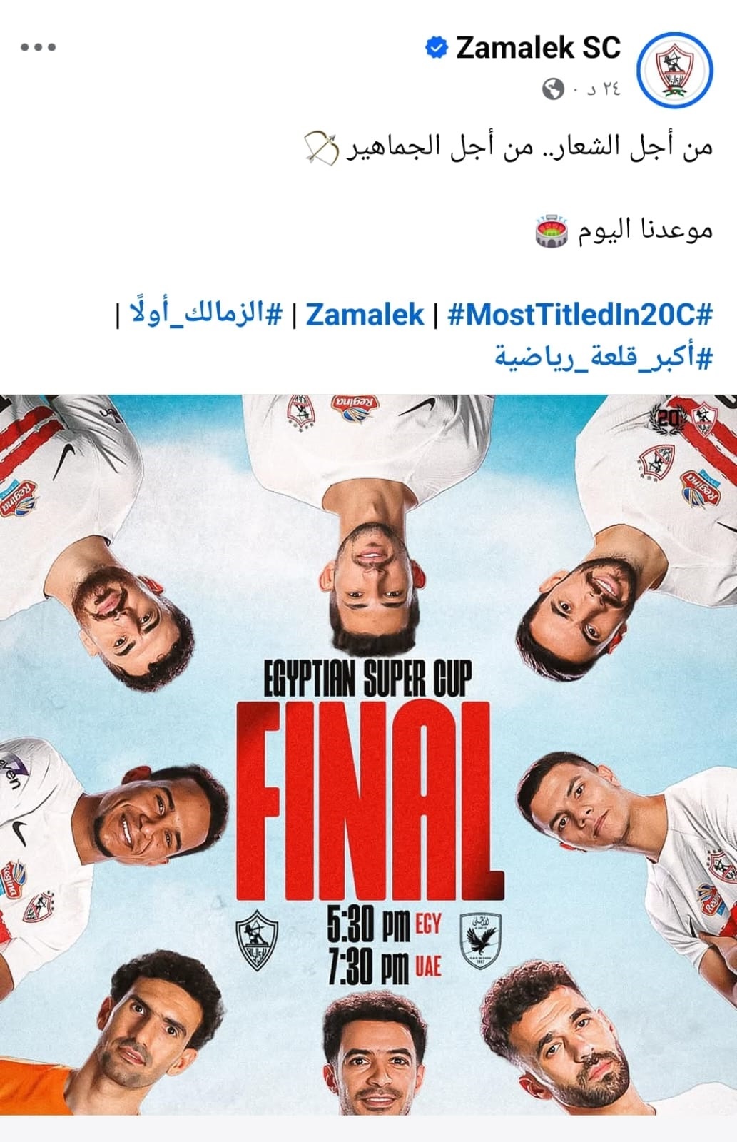 ونشرت الصفحة صورة لعدد من لاعبي الفريق مع موعد المباراة بتوقيت القاهرة والإمارات، مصحوبة بتعليق: "من أجل الشعار.. من أجل الجماهير".