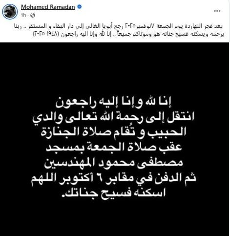 كما نعى رمضان والده في منشور آخر كتب فيه: "بعد فجر اليوم الجمعة، رجع أبي الغالي إلى دار البقاء والمستقر.