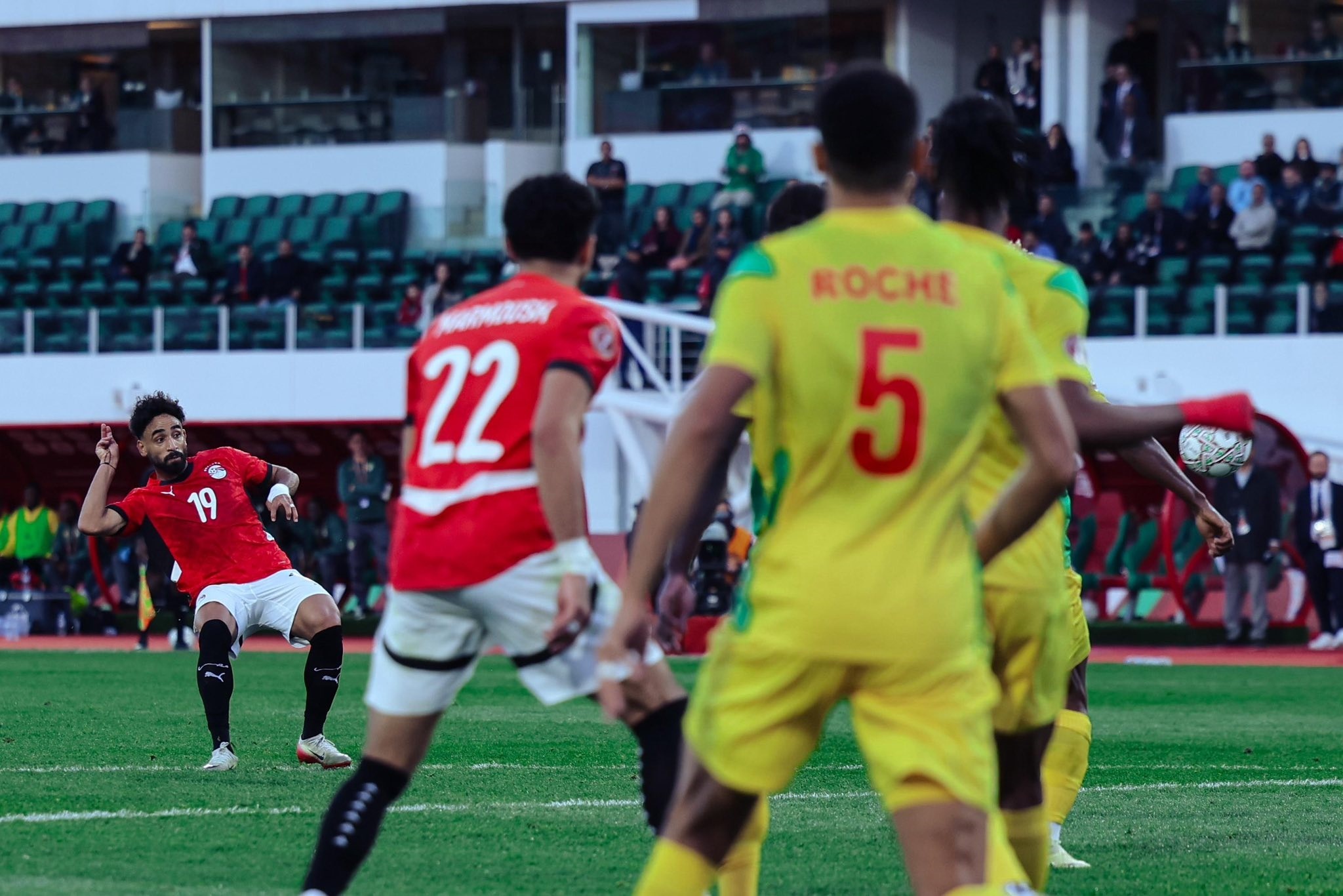 تعرض محمد حمدي لإصابة قوية في الركبة خلال الشوط الأول، مما اضطر حسام حسن لإجراء تبديل بنزول أحمد فتوح. وفي الشوط الثاني، قام المدير الفني بإدخال إمام عاشور وزيزو بدلاً من تريزيجيه وإبراهيم عادل لتعزيز القوة الهجومية للفريق.تشكيل منتخب مصر ضد بنين
