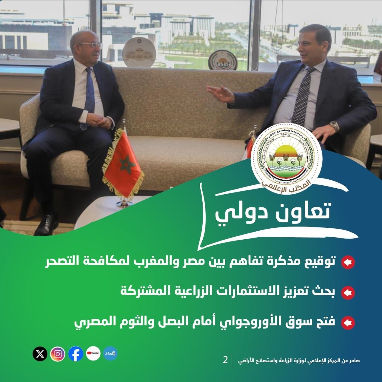 ففي مجال التعاون الدولي، شهدت العلاقات بين مصر والمغرب تطورًا ملحوظًا، تمثل في توقيع مذكرة تفاهم لمكافحة التصحر، إلى جانب بحث سبل تعزيز الاستثمارات الزراعية المشتركة، فضلًا عن استقبال عدد من الوفود الدولية لبحث التعاون في مجالات الحجر الزراعي والصحة الحيوانية والتنمية المستدامة.