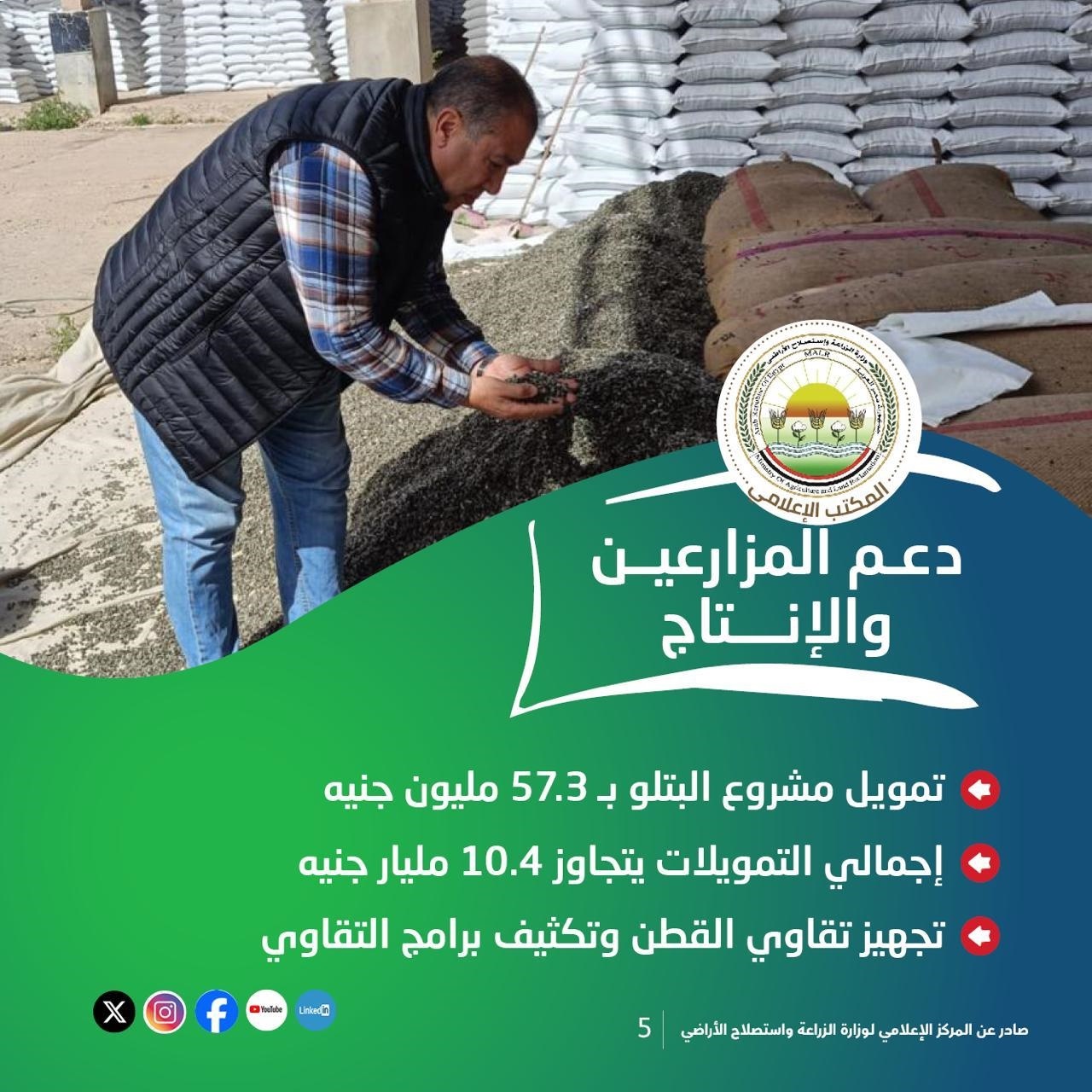 وعلى صعيد دعم المزارعين، وافقت الوزارة على تمويل جديد لمشروع البتلو بقيمة 57.3 مليون جنيه، ليصل إجمالي التمويلات إلى أكثر من 10.4 مليار جنيه، استفاد منها عشرات الآلاف من صغار المربين، وذلك في إطار التوسع في دعم الإنتاج الحيواني وتحقيق التوازن في الأسواق.