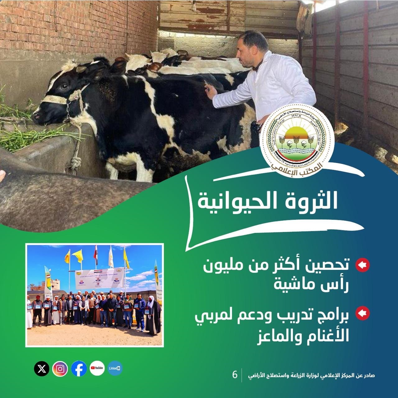 وفي قطاع الثروة الحيوانية، تم تحصين أكثر من مليون رأس ماشية ضمن الحملة القومية، إلى جانب تنفيذ برامج تدريبية لدعم صغار المربين، بما يسهم في زيادة الإنتاج وتحقيق الأمن الغذائي.
