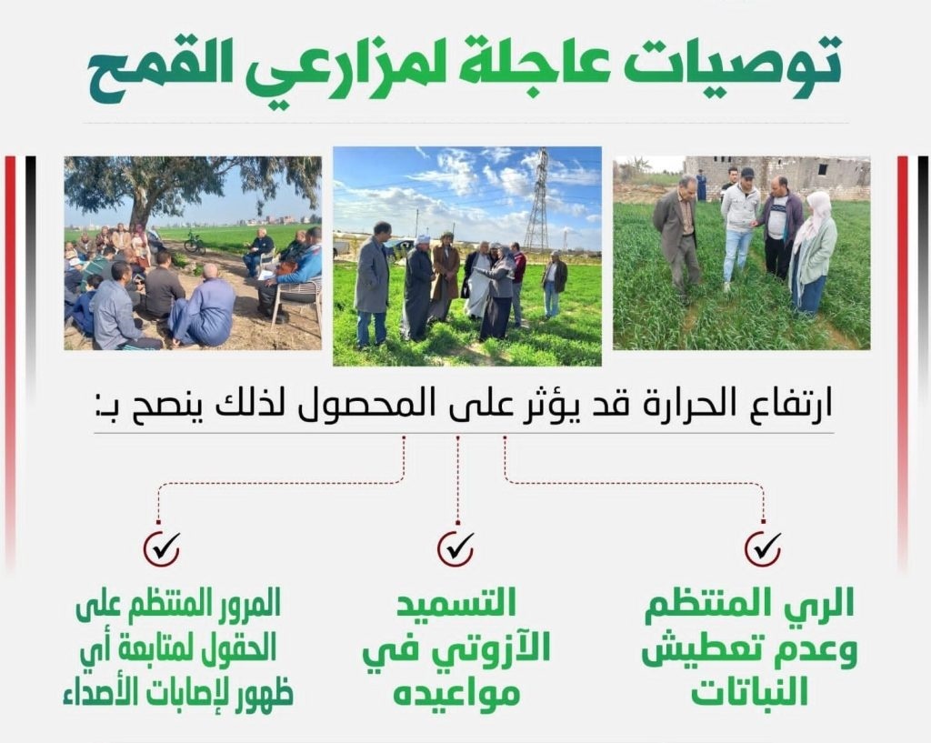 وشددت الوزارة على أن اتباع هذه التوصيات يسهم في تعزيز قدرة المحاصيل على تحمل التقلبات الجوية، والحد من الخسائر المحتملة، في إطار خطة الدولة لدعم المزارعين وضمان توافر الاحتياجات الاستراتيجية من القمح.
