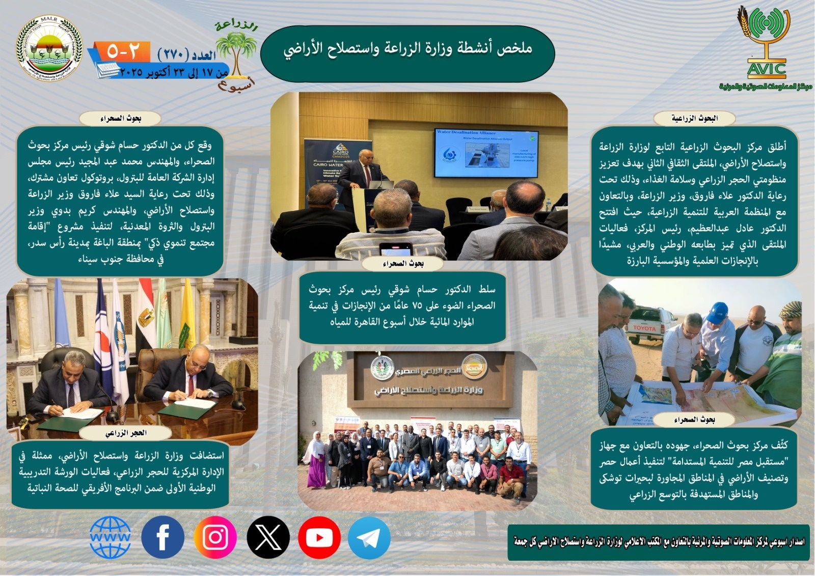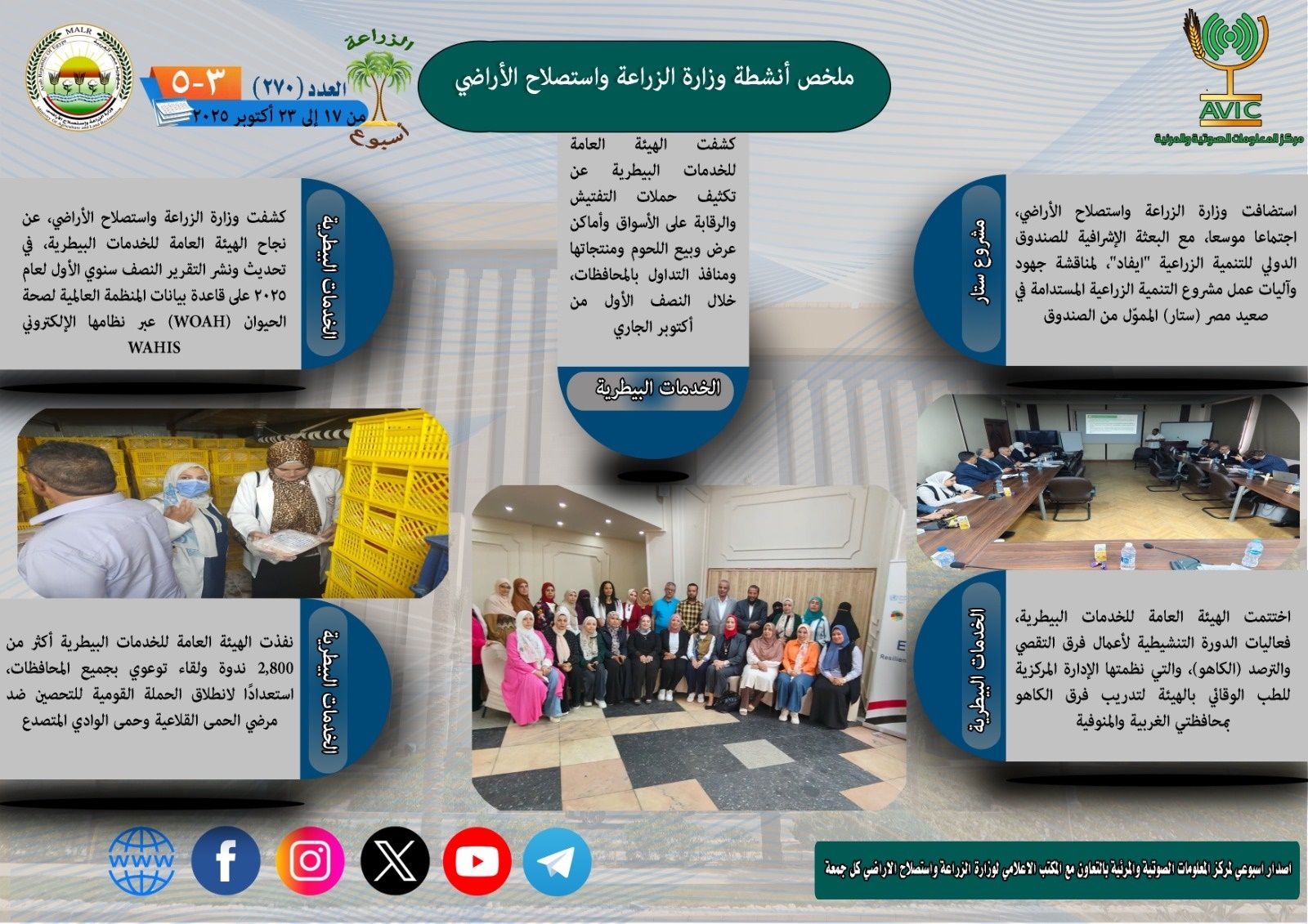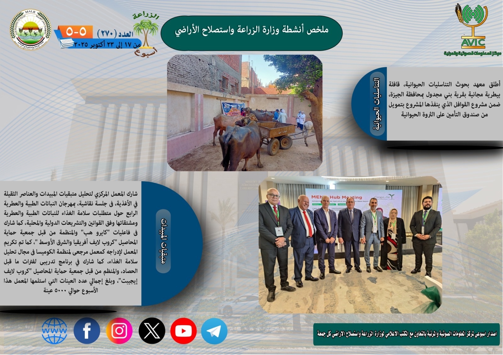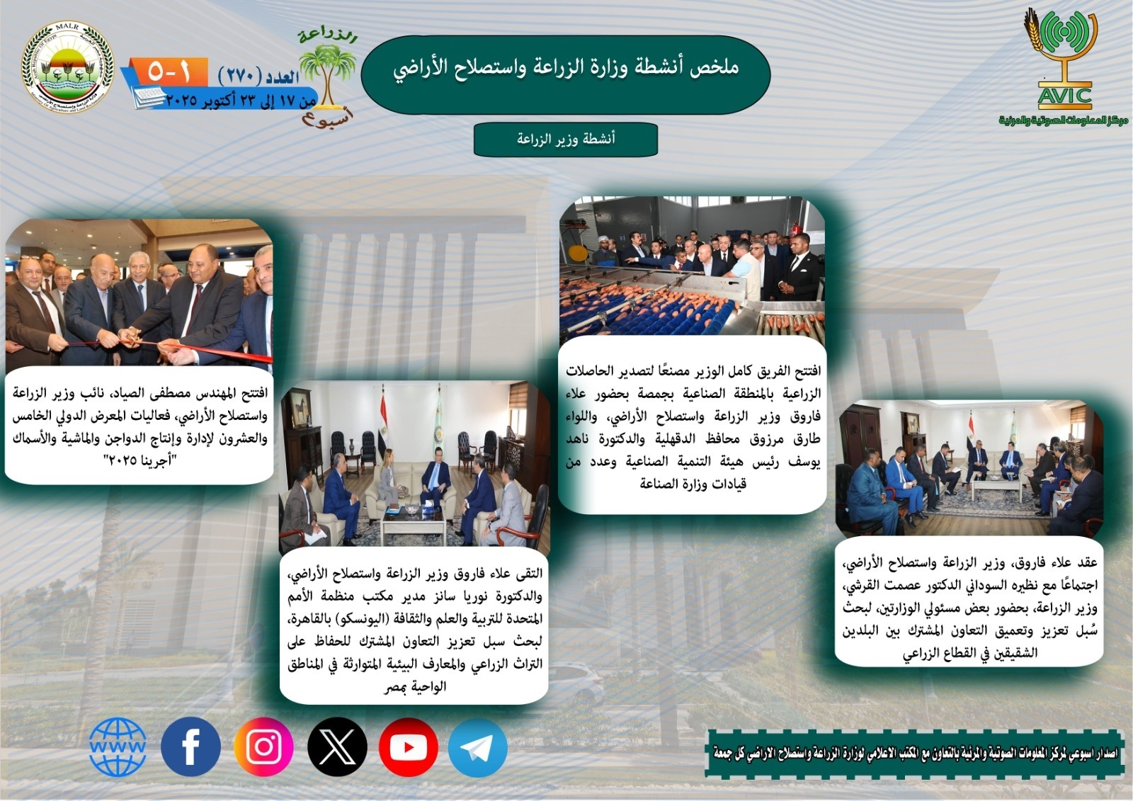 أصدر مركز المعلومات الصوتية والمرئية بوزارة الزراعة واستصلاح الأراضي،"الانفوجراف الاسبوعي" في نسخته رقم 270 حول الحصاد الاسبوعي لأهم أنشطة الوزارة، خلال الاسبوع الماضي في الفترة من 17 وحتى 23 أكتوبر الجاري، كما أصدر المركز ايضا ملخصا بالفيديو، حول انشطة الوزارة خلال نفس الفترة.