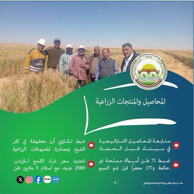وفيما يتعلق بالمحاصيل والمنتجات الزراعية، تابعت الوزارة التجمعات الزراعية في سيناء استعدادا لحصاد المحاصيل الاستراتيجية، مع ضبط الأسواق لضمان سلامة المنتجات، حيث تم ضبط 71 طن أسماك مملحة غير صالحة للاستهلاك، وتحفظ على كميات كبيرة من تقاوي الأرز المغشوشة في كفر الشيخ، ومصادرة المضبوطات مع اتخاذ الإجراءات القانونية. وفي إطار استعدادات موسم توريد القمح، أعلنت الوزارة تحديد سعر شراء الإردب بـ 2500 جنيه مع استلام 5 ملايين طن قمح من مساحة 3.7 مليون فدان وصرف المستحقات للمزارعين خلال 48 ساعة، وتوفير آلات الحصاد الحديثة.