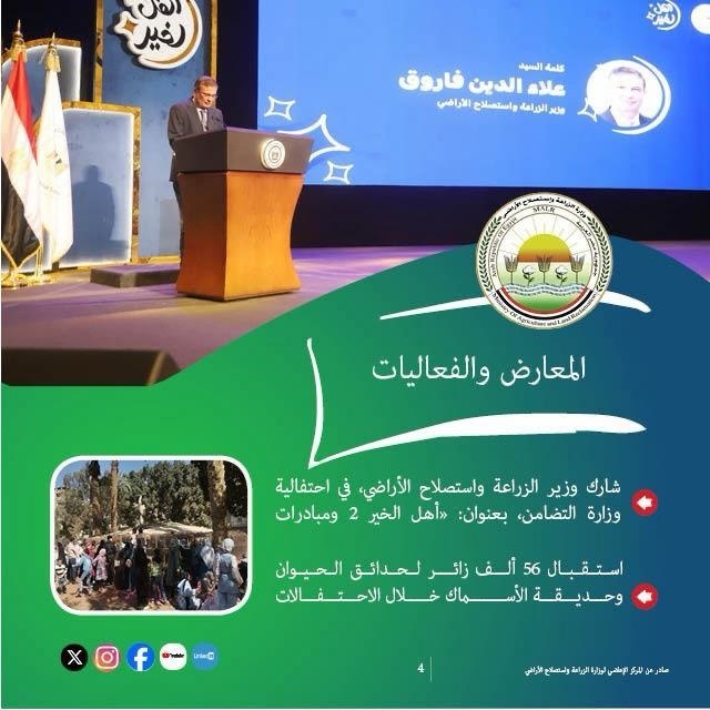 شهدت وزارة الزراعة واستصلاح الأراضي خلال الأسبوع الماضي نشاطاً مكثفا ومتنوعا، يعكس الحرص على تطوير القطاع الزراعي وتحقيق الأمن الغذائي، وتعزيز التعاون الدولي، إلى جانب تقديم أفضل الخدمات للمزارعين والمواطنين.