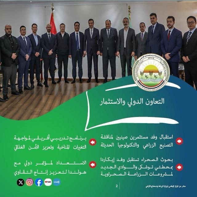 وعلى صعيد التعاون الدولي والاستثمار، استقبل علاء فاروق وزير الزراعة وفود من المستثمرين ورجال الأعمال الصينيين لمناقشة فرص الاستثمار المشترك في التصنيع الزراعي والتكنولوجيا الحديثة. كما استضافت الوزارة وفد إيكاردا بمحطتي توشكى والوادي الجديد لبحث التعاون في مشروعات الزراعة الصحراوية المبتكرة ونظمت الوزارة برنامجا تدريبيا لمبعوثين أفارقة حول التغيرات المناخية والأمن الغذائي، إلى جانب الاستعداد لمؤتمر دولي مع هولندا لتعزيز مكانة مصر كمركز إقليمي لإنتاج وتصدير التقاوي.