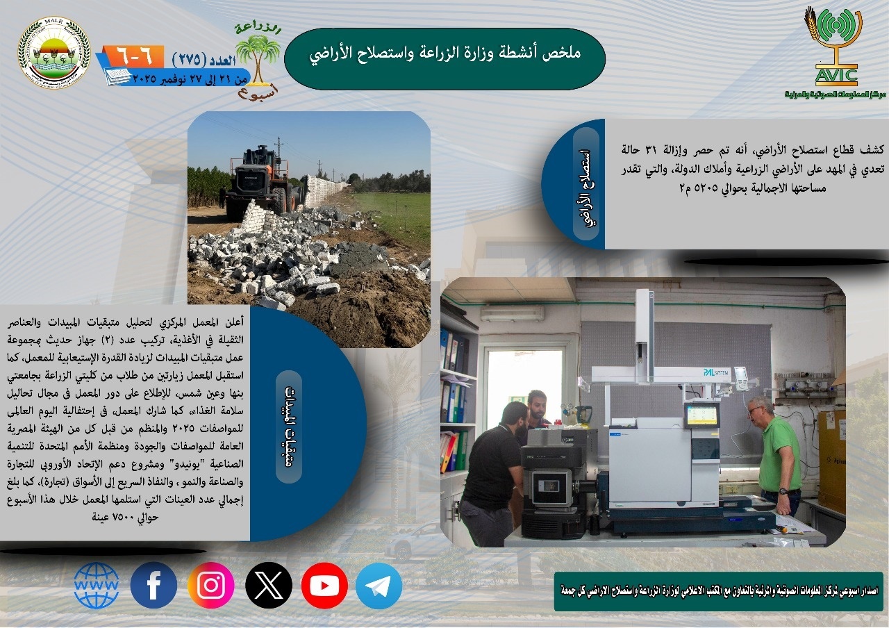 بينما أعلن المعمل المركزي لتحليل متبقيات المبيدات والعناصر الثقيلة في الأغذية، تركيب عدد (2) جهاز حديث بمجموعة عمل متبقيات المبيدات لزيادة القدرة الإستيعابية للمعمل، كما استقبل المعمل زيارتين من طلاب من كليتي الزراعة بجامعتي بنها وعين شمس، للإطلاع على دور المعمل فى مجال تحاليل سلامة الغذاء، كما شارك المعمل، فى إحتفالية اليوم العالمى للمواصفات 2025 والمنظم من قبل كل من الهيئة المصرية العامة للمواصفات والجودة ومنظمة الأمم المتحدة للتنمية الصناعية "يونيدو" ومشروع دعم الإتحاد الأوروبى للتجارة والصناعة والنمو ، والنفاذ السريع إلى الأسواق (تجارة)، كما بلغ إجمالي عدد العينات التي استلمها المعمل خلال هذا الأسبوع حوالي 7500 عينة.