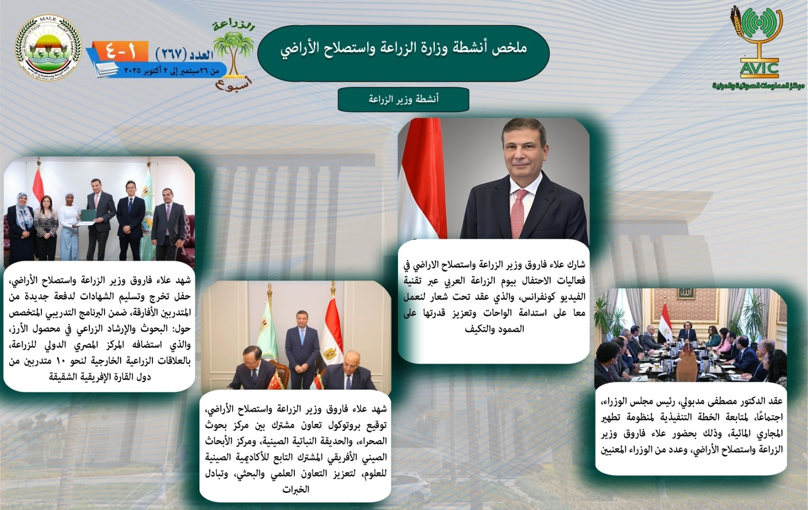 وشارك علاء فاروق وزير الزراعة واستصلاح الاراضي في فعاليات الاحتفال بيوم الزراعة العربي عبر تقنية الفيديو كونفرانس، والذي عقد تحت شعار لنعمل معا على استدامة الواحات وتعزيز قدرتها على الصمود والتكيف، كما شهد "فاروق" وزير الزراعة واستصلاح الأراضي، توقيع بروتوكول تعاون مشترك بين مركز بحوث الصحراء، والحديقة النباتية الصينية، ومركز الأبحاث الصيني الأفريقي المشترك التابع للأكاديمية الصينية للعلوم، لتعزيز التعاون العلمي والبحثي، وتبادل الخبرات، كذلك شهد الوزير، حفل تخرج وتسليم الشهادات لدفعة جديدة من المتدربين الأفارقة، ضمن البرنامج التدريبي المتخصص حول: البحوث والإرشاد الزراعي في محصول الأرز، والذي استضافه المركز المصري الدولي للزراعة، بالعلاقات الزراعية الخارجية لنحو 10 متدربين من دول القارة الإفريقية الشقيقة.