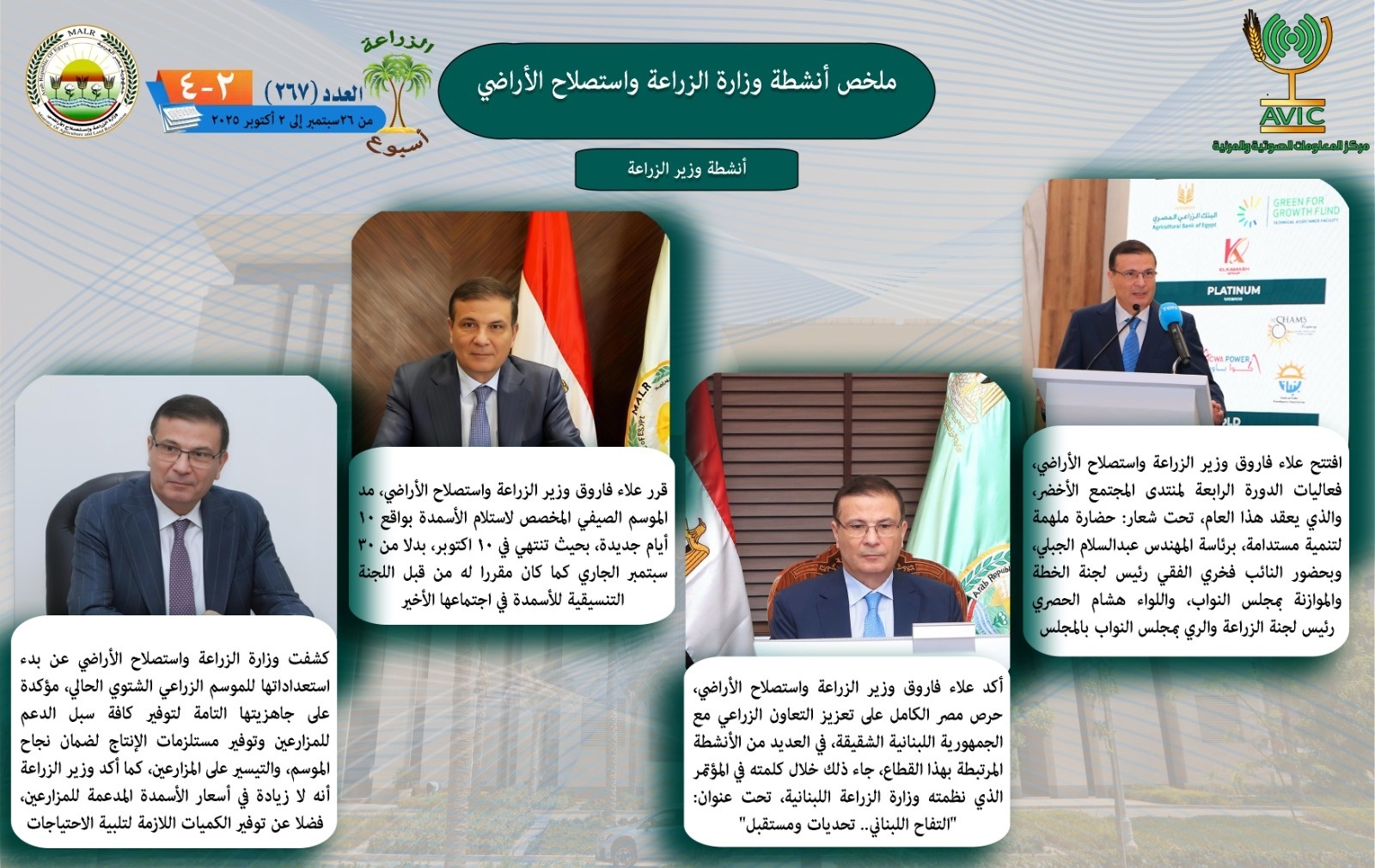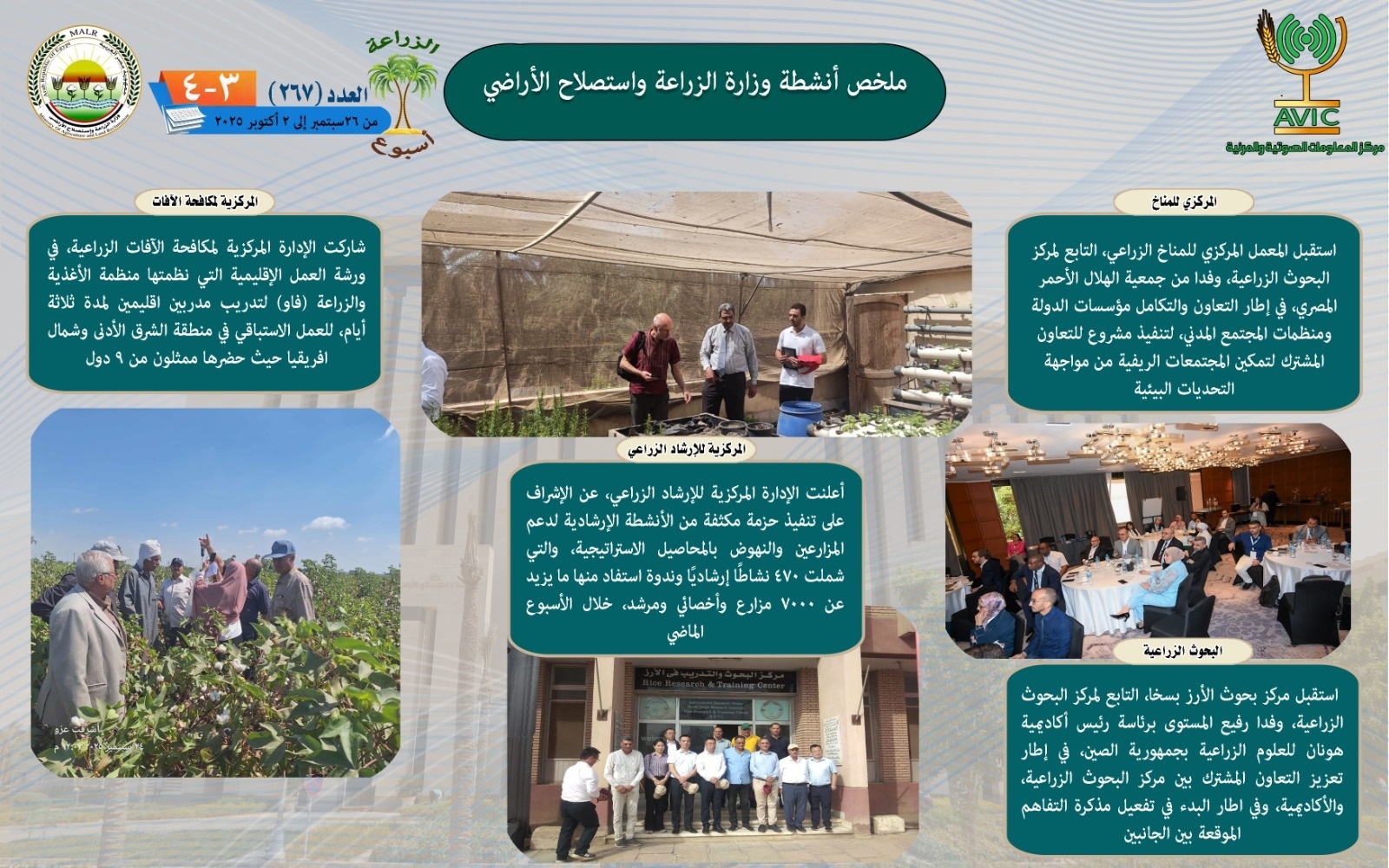 أصدر مركز المعلومات الصوتية والمرئية بوزارة الزراعة واستصلاح الأراضي، "الانفوجراف الاسبوعي" في نسخته رقم 267 حول الحصاد الاسبوعي لأهم أنشطة الوزارة، خلال الاسبوع الماضي في الفترة من 26 سبتمبر وحتى 2 أكتوبر الجاري، كما أصدر المركز ايضا ملخصا بالفيديو، حول انشطة الوزارة خلال نفس الفترة.
