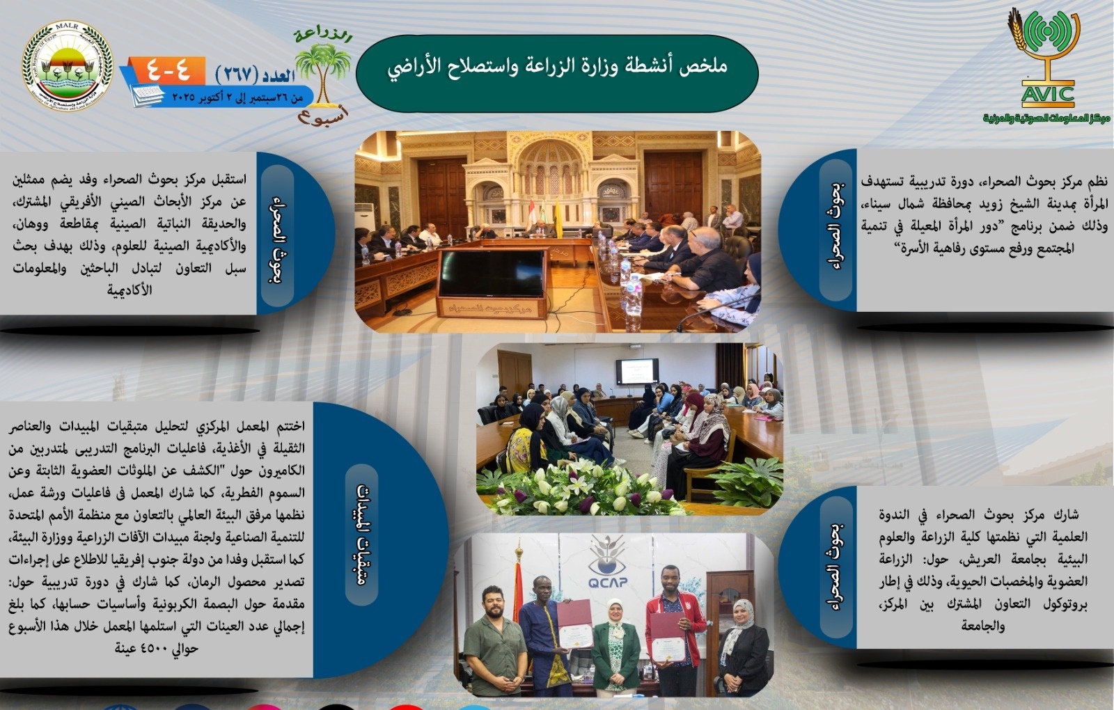 واستقبل مركز بحوث الأرز بسخا، التابع لمركز البحوث الزراعية، وفدا رفيع المستوى برئاسة رئيس أكاديمية هونان للعلوم الزراعية بجمهورية الصين، في إطار تعزيز التعاون المشترك بين مركز البحوث الزراعية، والأكاديمية، وفي اطار البدء في تفعيل مذكرة التفاهم الموقعة بين الجانبين، كما شاركت الإدارة المركزية لمكافحة الآفات الزراعية، في ورشة العمل الإقليمية التي نظمتها منظمة الأغذية والزراعة (فاو) لتدريب مدربين اقليمين لمدة ثلاثة أيام، للعمل الاستباقي في منطقة الشرق الأدنى وشمال افريقيا حيث حضرها ممثلون من 9 دول.