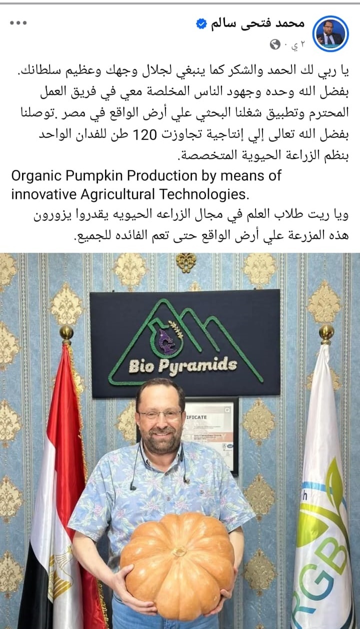 أثار منشور علمي للدكتور محمد فتحي سالم، خبير الزراعة الحيوية، موجة من الجدل والنقاش الواسع بين المتخصصين والعاملين في القطاع الزراعي المصري، عقب إعلانه الوصول بإنتاجية فدان "القرع العسلي" (Organic Pumpkin) إلى حاجز يتجاوز 120 طناً باستخدام نظم الزراعة الحيوية المتخصص.