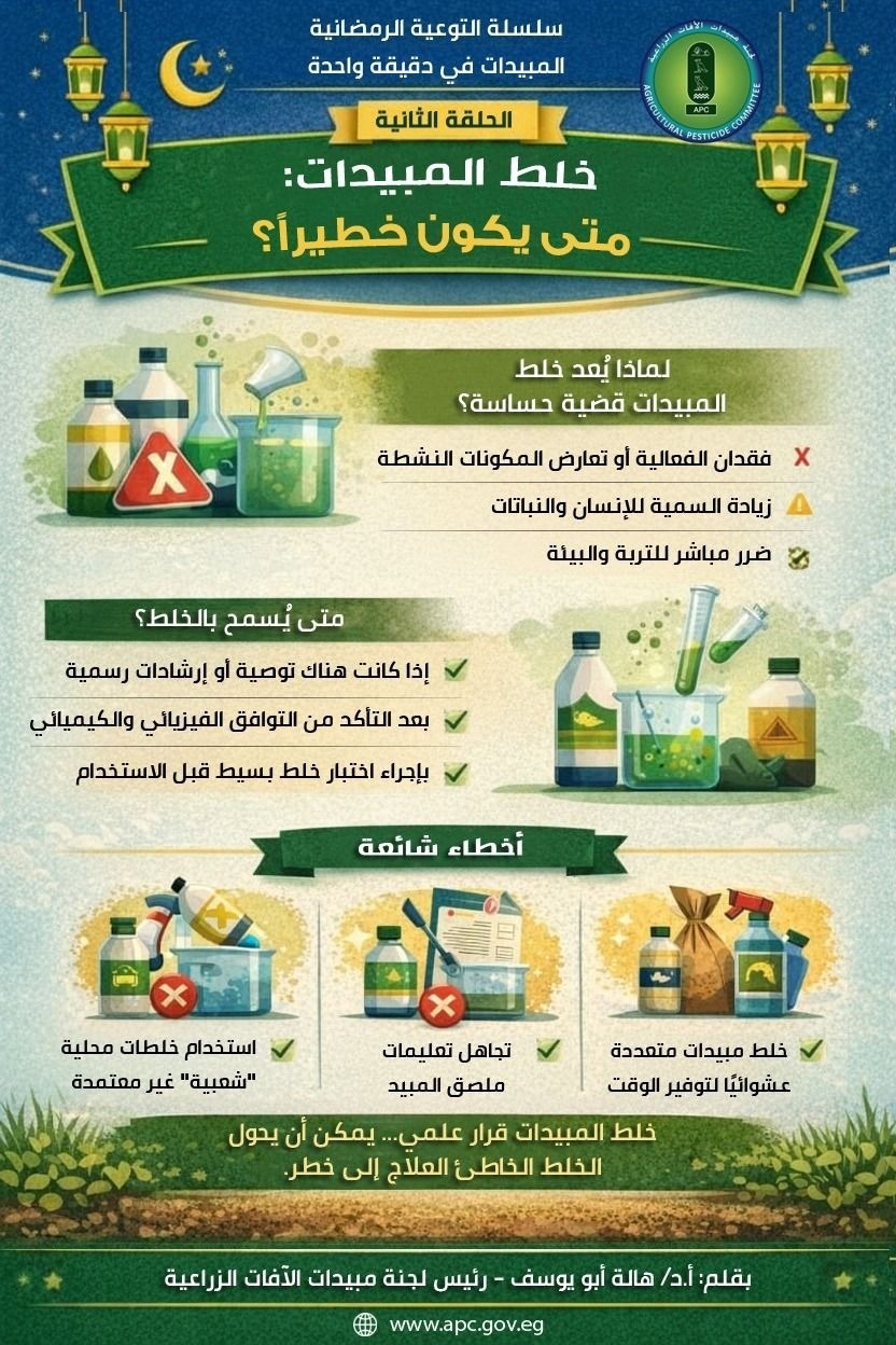 خلط المبيدات قرار علمي.. الخطأ فيه قد يحول العلاج إلى خطر.وتهدف هذه المبادرة إلى رفع مستوى الوعي بين المزارعين وحماية الزراعة والحياة والبيئة من مخاطر الاستخدام العشوائي للمبيدات.