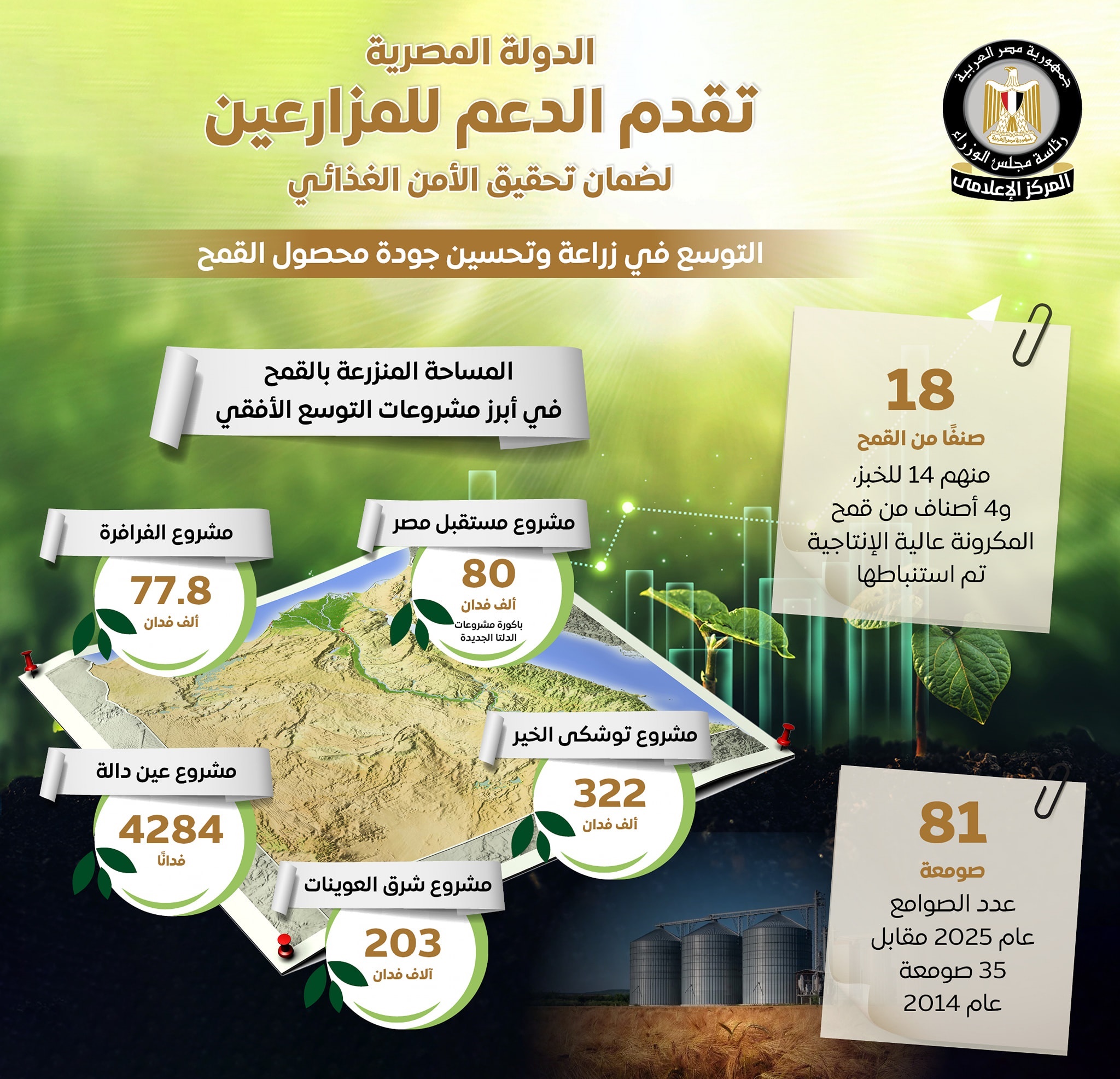قام المركز الإعلامي لمجلس الوزراء بنشر إنفوجرافات عبر منصاته على مواقع التواصل الاجتماعي، استعرض خلالها جهود الدولة في التوسع الأفقي والرأسي في زراعة القمح وتحسين جودة إنتاجه، في إطار تنفيذ توجيهات القيادة السياسية لتحقيق الأمن الغذائي والاكتفاء الذاتي من المحاصيل الاستراتيجية.