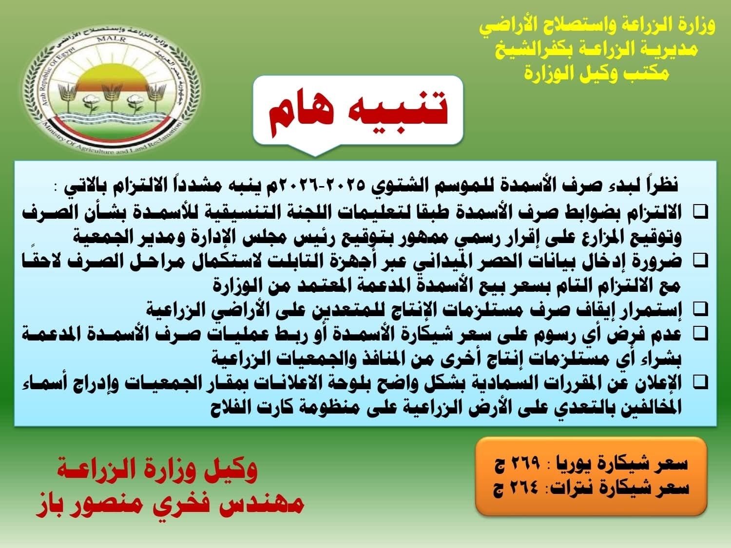 وأكد أن أسعار الأسمدة لهذا الموسم محددة وفق تعليمات الوزارة، حيث يبلغ سعر شيكارة اليوريا 269 جنيهًا، وسعر شيكارة النترات 264 جنيهًا، لضمان استفادة المزارعين من الدعم الكامل وتحقيق أعلى إنتاجية ممكنة.