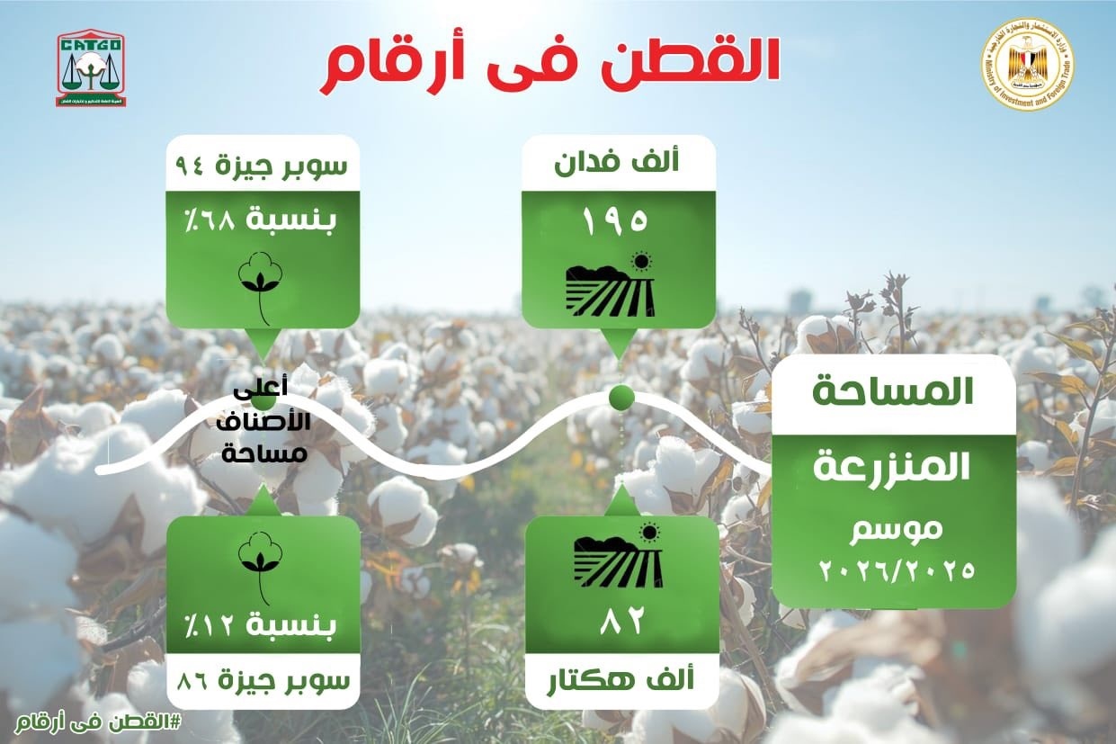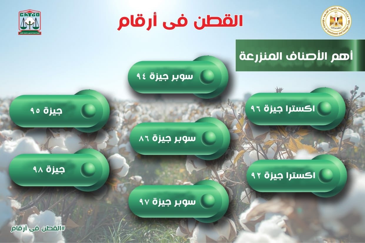 في إطار استراتيجية وزارة الاستثمار والتجارة الخارجية الرامية إلى تنمية وتنويع التجارة الخارجية وتعزيز القدرة التنافسية للصادرات المصرية، تصدر صنف "سوبر جيزة 94" الموسم الجديد للقطن، مسجلاً أعلى المساحات المنزرعة وأكثر الأصناف طلبًا في الأسواق العالمية.