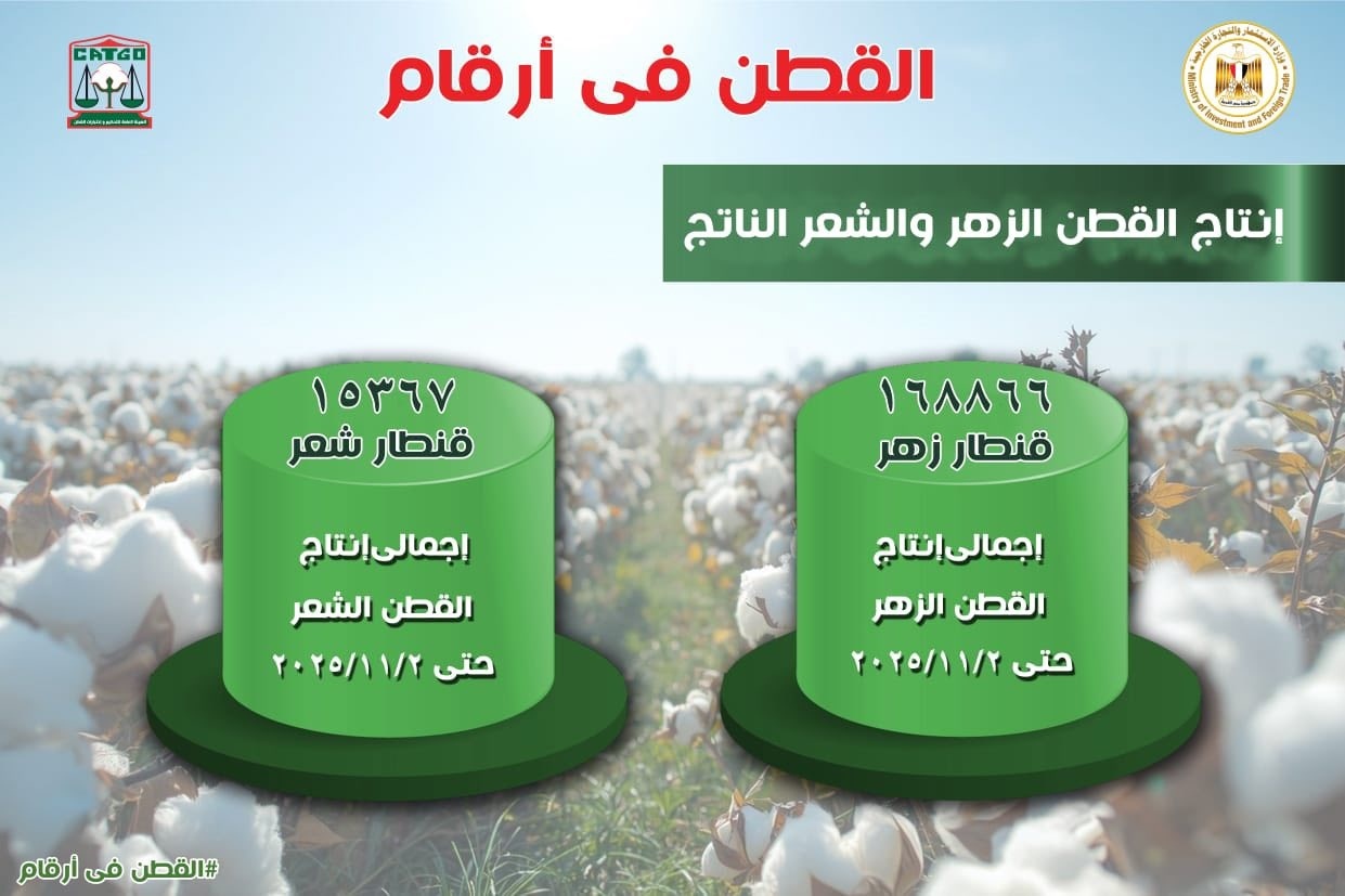 أما عن الإنتاج، فقد بلغ إجمالي ما تم فرزه من الأقطان الزهر حتى الثاني من نوفمبر نحو 169 ألف قنطار، فيما وصل إجمالي إنتاج القطن الشعر منذ بداية الموسم إلى نحو 15 ألف قنطار. وتستمر أعمال الجني والفرز بالمحافظات المنتجة للقطن وفق الخطة الزمنية المعتمدة للموسم الحالي.