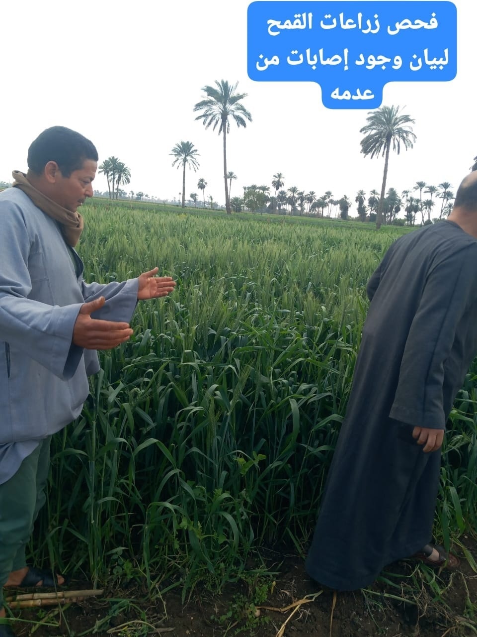 أظهرت المعاينة أن الأرض محل الشكوى مزروعة بصنف القمح "جميزة 11"، وهو من الأصناف غير المدرجة ضمن السياسة الصنفية المعتمدة للمنطقة، كما تم استخدام تقاوي كسر غير معتمدة. بالمقارنة مع الأراضي المجاورة، تبين أن حالة المحصول المحيط جيدة، بينما ظهرت بعض البؤر المحدودة المصابة داخل أرض الشاكي.التوصيات الفنية:
