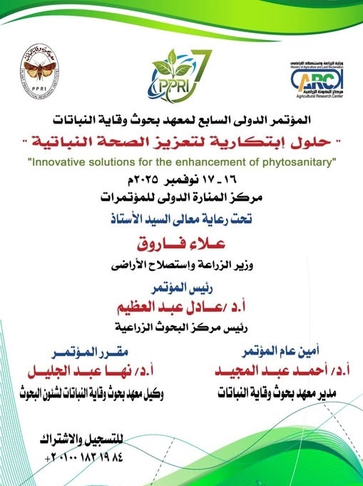 في إطار حرص وزارة الزراعة واستصلاح الأراضي على دعم البحث العلمي وتطوير منظومة الوقاية النباتية، ينظم معهد بحوث وقاية النباتات التابع لمركز البحوث الزراعية، المؤتمر الدولي السابع تحت عنوان: "حلول ابتكارية لتعزيز الصحة النباتية"