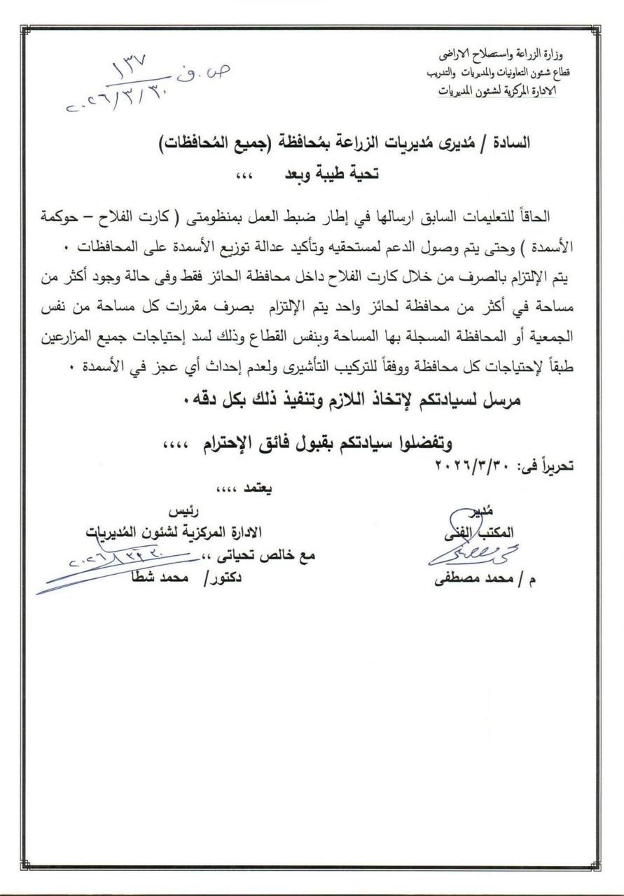 أصدرت وزارة الزراعة واستصلاح الأراضي، ممثلة في الإدارة المركزية لشؤون المديريات، بتاريخ 30 مارس 2026، خطابًا رسميًا موجهاً لمديري مديريات الزراعة في جميع المحافظات، تضمن تعليمات مشددة بشأن تنظيم صرف الأسمدة المدعمة عبر منظومة كارت الفلاح، لضمان وصول الدعم لمستحقيه الفعليين وتحقيق العدالة في التوزيع، ومنع حدوث أي عجز في كميات الأسمدة المتاحة بكل محافظة.