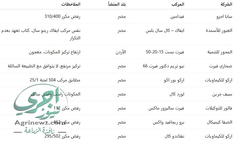 وجاء الرفض بناءً على توصية اللجنة الفنية للمخصبات بعد مراجعة الطلبات المقدمة، حيث شملت المركبات المرفوضة شركات محلية مثل: سابا اجرو، العبور للاسمدة، المحور للتنمية الزراعية، صحاري فيرت، اركو للكيماويات، سيف جرين، فالور، الصفا كيميكال، وذلك لأسباب منها: