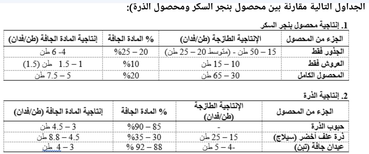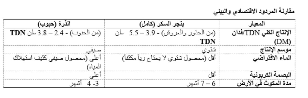 نستخلص من هذا الجدول أن إنتاجية جذور البنجر على أساس المادة الجافة قد تتجاوز إنتاجية حبوب الذرة. وقيمتها بالنسبة للطاقة مماثلة لحبوب الذرة، لكن مصدر الطاقة في البنجر هو السكر بينما في الذرة هو النشا.
