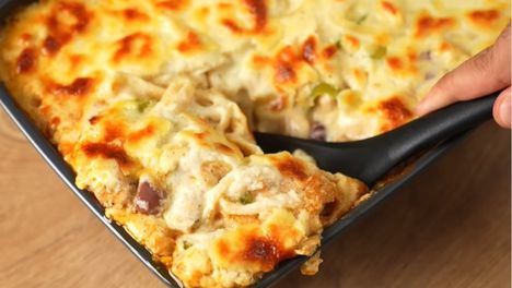 في طاجن فرن، توضع نصف كمية البشاميل، ثم تُضاف المكرونة، الدجاج والخضروات ويُخلط المزيج جيدًا.