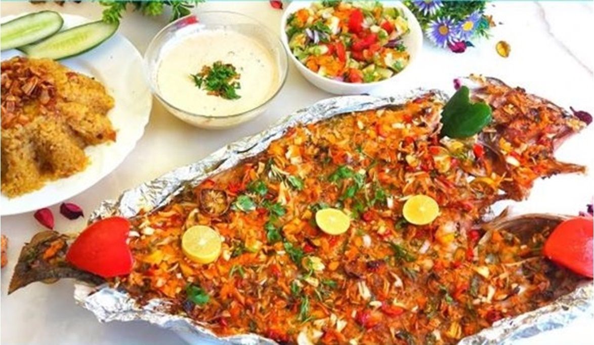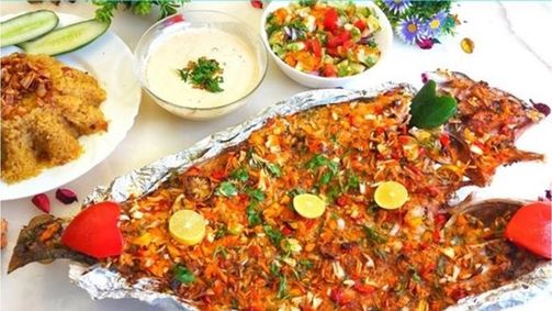 5- تُوضع الصينية في فرن ساخن حتى ينضج السمك ويكتسب لونًا ذهبيًا شهيًا، ويُقدم ساخنًا.