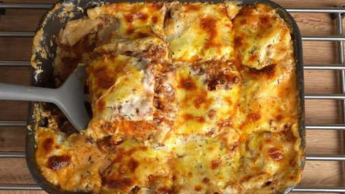 ادهني صينية بايركس بطبقة رقيقة من البشاميل، ثم ضعي طبقة لازانيا تعلوها طبقة لحم مفروم. كرّري الخطوة حتى انتهاء الكمية، وفي النهاية أضيفي طبقة من البشاميل والجبنة الموتزاريلا.
