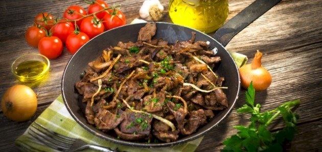 تضاف قطع الكبدة إلى البصل وتقلب لمدة 5 دقائق تقريبًا حتى يتغير لونها.