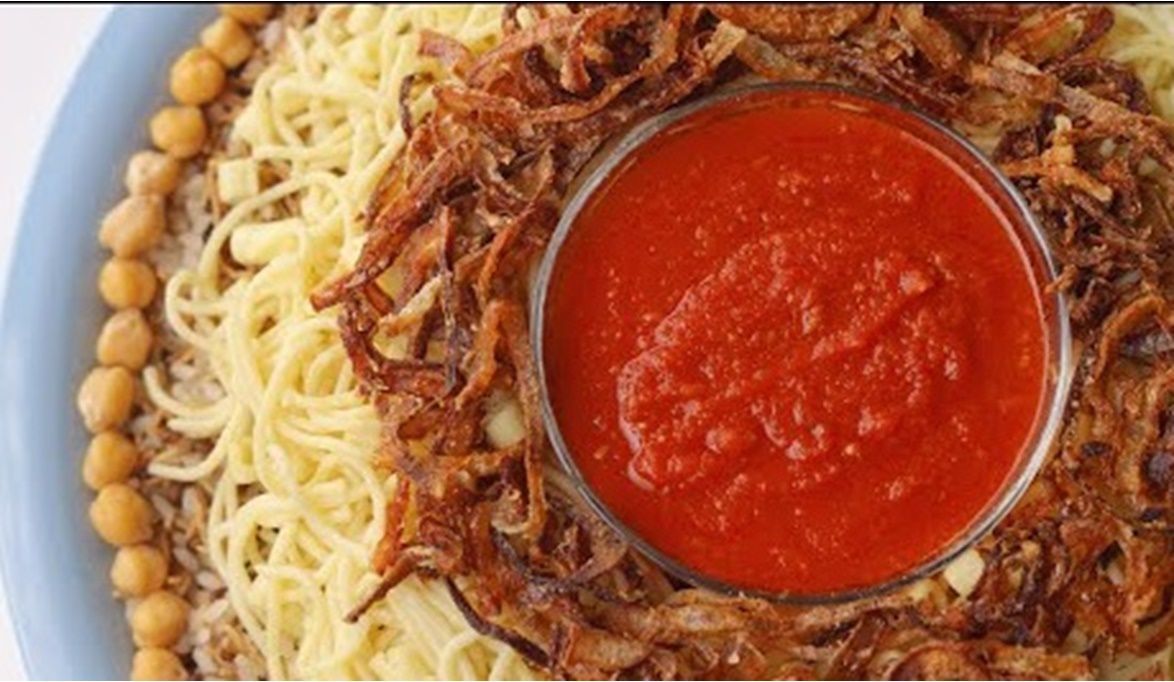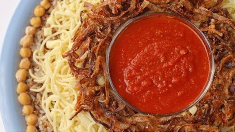 قدمي الكشري مع البصل المقرمش والصلصة والدقة حسب الرغبة.