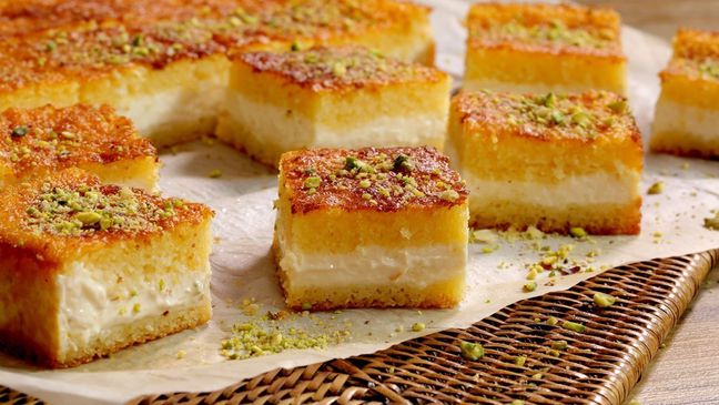 البسبوسة بالقشطة من الحلويات التي تجمع بين الطراوة والنكهة الغنية، لتصبح خيارًا مثاليًا للأسر والعزائم الرمضانية.