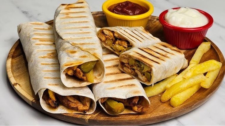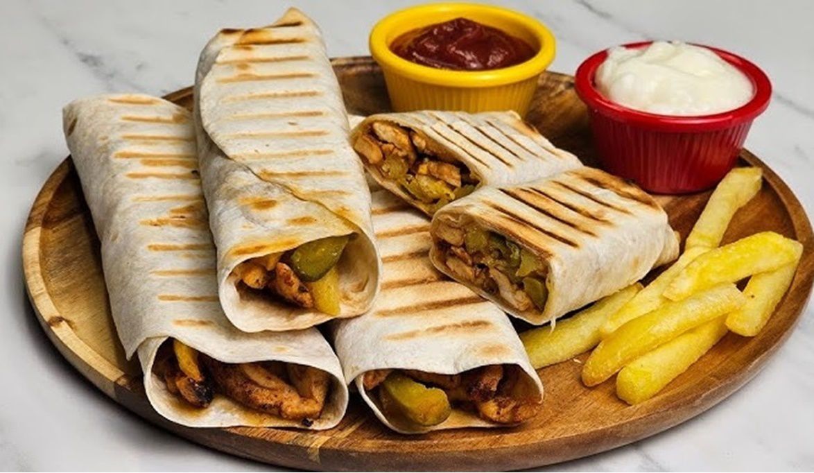 5. تُشوى لفائف الشاورما في مقلاة ساخنة على الجانبين حتى تكتسب لونًا مميزًا ومقرمشًا.