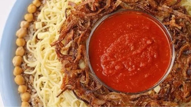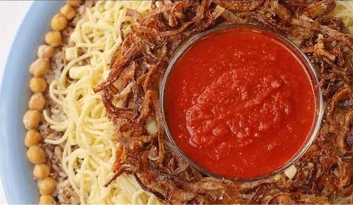 قدمي الكشري مع البصل المقرمش والصلصة والدقة حسب الرغبة.